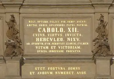 Artists like Jean Eric Rehn and Fredrik Wilhelm Scholander were important to the palace's grand interior during the end of the 18th and 19th century, when pilasters, columns, wall decorations, etc. were added.[35] Among those sculptors, painters and craftsmen who also contributed during the later renovations were Louis Masreliez (interior work in Classicism and Neoclassicism), Jean Baptiste Masreliez (interior work), Axel Magnus Fahlcrantz (the Logården Wall and the wrought iron fence at Logården), Johan Niclas Byström (sculptures), Sven Scholander (restorations), Johan Axel Wetterlund (facade sculptures of noted men and four allegorical groups on the Logården Wall), Julius Kronberg (ceiling paintings) and Kaspar Schröder (facade sculptures; lion masks at the courtyard facade).[36][37][19]