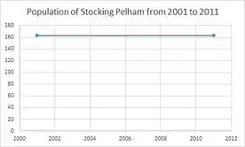 Stocking Pelham had a population of 163 according to the 2001 census[2] and the total population was also 163 in 2011 according to the 2011 census.[4] This is illustrated in the graph entitled 'The Population of Stocking Pelham from 2001 to 2011' on the bottom right panel of this page, the straight horizontal line shows that the population was the same after ten years. Historically speaking, much of Stoking Pelham was rather heavily dependent on agriculture for income and in some cases this is still apparent, considering the nature of the environment this may explain why there are now many retired citizens residing there.[5]