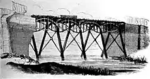 Stephenson advocated the use of steam locomotives on the line.[15] Pease visited Killingworth in mid-1822[27] and the directors visited Hetton colliery railway, on which Stephenson had introduced steam locomotives.[28] A new bill was presented, requesting Stephenson's deviations from the original route and the use of "loco-motives or moveable engines", and this received assent on 23 May 1823.[29] The line included embankments up to 48 feet (15 m) high, and Stephenson designed an iron truss bridge to cross the River Gaunless. The stone bridge over the River Skerne was designed by the Durham architect Ignatius Bonomi.[30][note 7]