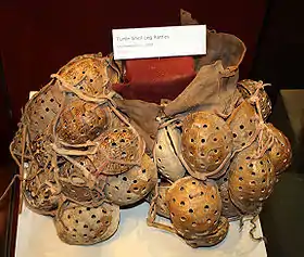 The women wear tortoise shell shakers, or shackles, on both legs[2] (typically six to 12 on each leg).[11] The shakers are hollowed out tortoise shells which have holes drilled in them and are filled with certain river rocks that will make them rattle. The traditional Creek and Seminole shell shakers are made of terrapin or box turtle shells. Lydia Sam, a Natchez-Cherokee traditionalist, was the first to dance with tin, condensed milk can leg shackles in the 1920s. Some ground leaders insist on the use of the terrapin by head lady shell shakers. This tradition continues today and most women start out with a set of "cans" before moving up to having their own set of shells. Women stomp dancers are called "Shell Shakers" or "Turtles."