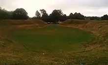 This transition was, according to historian Ronald Hutton, "as fundamental as that from the Mesolithic had been."[13] Archaeological pollen analysis has shown that it was a period when scrub and weeds were spreading over what had formerly been cultivated fields, and forests that had previously been cleared began to grow back.[14] Chambered tombs were blocked up and abandoned, implying that people were ceasing to use them as cultic sites.[14] Several former causewayed enclosures were converted into defensive structures with gateways and walls, and in some cases they were attacked. Evidence for conflict has been found at Carn Brea in Cornwall, Hambledon Hill in Dorset, and Crickley Hill in Gloucestershire.[14] Various archaeologists have suggested that this was a period of particular turmoil within the British Isles, perhaps caused by an overuse of land, the failure of crops, famine, plague, climatic change, or an increase in population that was not supported by the food supply.[14]