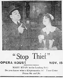 Stop Thief! is a lost[1] 1915 silent film comedy drama directed by George Fitzmaurice and starring Mary Ryan. It was produced by George Kleine and released through Kleine and Edison.[2]