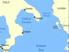 The Strait of Otranto (Albanian: Ngushtica e Otrantos; Italian: Canale d'Otranto; Croatian: Otrantska Vrata) connects the Adriatic Sea with the Ionian Sea and separates Italy from Albania. Its width at Punta Palascìa, east of Salento is less than 72 km (45 miles; 39 nautical miles).[1] The strait is named after the Italian city of Otranto.