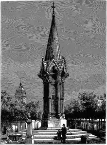 In 1879, a large monument was erected in St John's churchyard in Stratford Broadway, to commemorate the 13 and others who were executed or tortured in Stratford during the persecutions. Designed by J T Newman, it consists of an ornate hexagonal column, capped with a 12-sided spire rising to a height of 65 feet. One side of the column carries a terra cotta plaque, sculpted in relief, based on the illustration of the martyrdom in Foxe's book. The other panels carry the names of the 13 martyrs, together with Elizabeth Warne (burnt 23 August 1555), Stephen Harwood (burnt 30 August 1555), Hugh Laverock and John Apprice (both burnt 15 May 1556). Also included are Patrick Packingham, who was actually executed at Uxbridge and the Reverend Thomas Rose, the Vicar of All Saints Church, West Ham, who "was tortured and exiled for preaching against auricular confession, transubstantiation, purgatory and images".[1] The memorial is Grade II listed on the National Heritage List for England.[2]