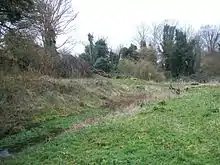 The entire moat ditch circuit is, bar the south side, enclosed by an external counterscarp bank, the best definition being found around the western half of the site.[1] With regards to this western counterscarp bank, two elements are distinctly visible: the first is a 7–9 m (23–30 ft) low spread platform 2 m (6 ft 7 in) above exterior ground level with subsidiary bank built on it, upon which modest evidence of ridge-and-furrow cultivation was found,[Note 1] whilst the second longer southerly element is 16 m (52 ft) in length, reaches a maximum width of 6 m (20 ft) and a maximum height of 0.3 m (1 ft 0 in).[1] A highly substantial counterscarp bank exists to the north, which is 10 m (33 ft) at its widest; a single elongated segment 0.5 m (1 ft 8 in) above the exterior ground surface and around 3 m (9.8 ft) above the water level in the moat ditch circuit stands.[1] The mounds and heightenings found along this bank serve as evidence of purposeful re-working, cultivation and enhancement.[1]