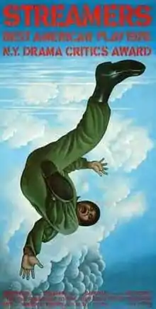 The title is a reference to parachutes that fail to open.[1] Streamers originally was a one-act play entitled Knives Rabe completed in the late 1960s prior to writing the first two-thirds of his trilogy. While working as a journalist in New Haven, Connecticut, he expanded it into a full-length play. Under the direction of Mike Nichols, it premiered at the Long Wharf Theatre on January 30, 1976.[2] The cast included Herbert Jefferson, Jr. as Roger, Peter Evans as Richie, John Heard as Billy, Joe Fields as Carlyle, Dolph Sweet as Cokes, and Kenneth McMillan as Rooney.[3]