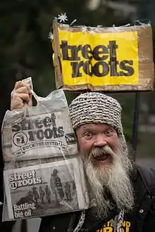 Street Roots is a Portland, Oregon, United States based homeless advocacy group[3] and a weekly alternative newspaper that covers homeless issues[4] established in 1998. The newsprint is sold by and for the homeless in Portland.[5] The paper is published every Friday and sold through vendors who are currently or formerly homeless. The paper's editorial position is homeless advocacy. Vendors purchase the paper for 25 cents and sell them for $1 and keep the difference of 75 cents. The paper features alternative news, interviews, and poetry written by local journalists as well as the homeless and those who work with them. Street Roots is a member of the North American Street Newspaper Association and the International Network of Street Papers.