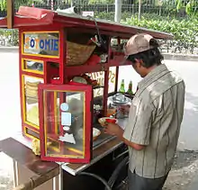 Indonesian street food is a collection of ready-to-eat meals, snacks, fruits and drinks sold by hawkers or vendors at warung food stalls or food carts. Street food in Indonesia is a diverse mix of local Indonesian, Chinese, and Dutch influences.[1] Indonesian street food are usually cheap, offer a great variety of food of different tastes, and can be found on every corner of the city.[2]