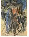 The street scenes are a work of art by the artists Ernst Ludwig Kirchner made between 1913 and 1915. They are dubbed to be one of the most important works of German expressionism. It consists of eleven paintings, 32 pages from sketchbooks, 15 ink brush drawings, 17 pastel and chalk drawings, 14 woodcuts, 14 etchings and 8 lithographies. The work deals with the Berlin of the early 20th century and how it is developing into a metropolis. A lot of "Koketten" (prostitutes) are depicted as a metaphor for the hectic pace and sensuality of the growing city. There are also a lot of references to be found in the cycle.