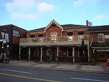 In 1855, William Graydon and Peter Douglass built a large brick building, and sold it in 1859 to Bennet Franklin, a partner in Barber Brothers Toronto Woollen Mills. It became known as Franklin House. In 1910, under new ownership, the name was changed to the Queen's Hotel. Although it ceased to operate as a hotel when its public room was closed with the enforcement of the Canada Temperance Act, it continued to be used for commercial purposes. At present, it has been designated under the terms of the Ontario Heritage Act and protected by a heritage easement, and now houses a restaurant and a variety of small businesses and offices.