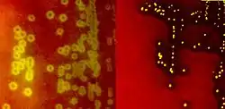 Species of Streptococcus are classified based on their hemolytic properties.[9] Alpha-hemolytic species cause oxidization of iron in hemoglobin molecules within red blood cells, giving it a greenish color on blood agar. Beta-hemolytic species cause complete rupture of red blood cells. On blood agar, this appears as wide areas clear of blood cells surrounding bacterial colonies. Gamma-hemolytic species cause no hemolysis.