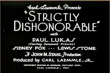Strictly Dishonorable is a 1931 pre-Code romantic comedy film directed by John M. Stahl and starring Paul Lukas, Sidney Fox and Lewis Stone, George Meeker, and Sidney Toler. It was written by Gladys Lehman and based on Preston Sturges' 1929 hit Broadway play of the same name.[1] Strictly Dishonorable was Sturges' second play on Broadway, and his first to be filmed.