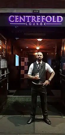 Strip clubs have a variety of configurations and staffing needs. Some clubs employ a host to emcee the show, in addition to a DJ. Hosts are more common in busier clubs or shifts, and during special, such as amateur night and featured acts. If the club charges a fee for entry, specialized personnel may work the door to collect the cover. A common practice is to employ young women, which are known in the industry as door girls, for this function.[106] In certain areas, doormen working outside the strip club will act as "hype men" enticing people to enter and sample the show and services.[143] The Block in Baltimore, Maryland has aggressive doormen stationed at nearly every entrance, only feet apart in a highly concentrated area of clubs.[144] Broadway in San Francisco, California has fewer clubs clustered together, but practices similar activities with their doormen.[133][145]