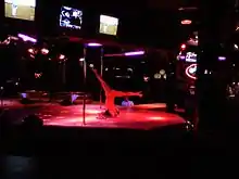 A main stage is where a featured performer will dance as part of a rotation.[60] In most clubs the main stage is a dominant feature of the layout and the center of activity.[5] A common type of strip club main stage is the thrust stage, also known as a runway stage,[90] but the other major forms are also used regularly. Theatre in the round is also a popular form of strip club staging for the main stage. During each set of one or more songs, the current performer will dance on stage. A dancer collects tips from customers either while on stage or while mingling with the audience after her performance. A customary tip (where customers can do so at the stage) is a dollar bill folded lengthwise and placed in the dancer's garter from the tip rail.[59][60] The area of the tip rail is equivalent to the apron in traditional theatre. It is referred to in slang as "ringside", "gynecology row", "pervert row", and other names.[59][91]