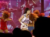 Aguilera gave a performance of "Beautiful" on Saturday Night Live on March 15, 2003, where she also sang "Fighter".[50] At the 2003 MTV Video Music Awards, Aguilera performed with Madonna, Britney Spears and Missy Elliott a medley of Madonna's songs "Like a Virgin" and "Hollywood", and Elliott's "Work It" on August 23, 2003.[51] Towards the end of "Hollywood", Madonna kissed both Aguilera and Spears during the performance, making huge tabloid stories and fuss from the public, and marking it as one of the most iconic performances from the MTV Video Music Awards history.[51] Later that night, she also performed "Dirrty" and "Fighter" with Redman and guitarist Dave Navarro.[51] On January 16, 2004, she performed "Walk Away" on the Late Show with David Letterman.[52] On February 8, 2004, Aguilera performed "Beautiful" at the 46th Annual Grammy Awards (2004), where she also won a Grammy Award for Best Female Pop Vocal Performance for the song.[53]
