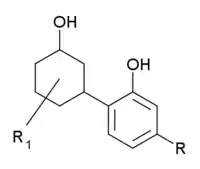 Cyclohexylphenols: Any compound containing a 2-(3-hydroxycyclohexyl)phenol structure with substitution at the 5-position of the phenolic ring by an alkyl, haloalkyl, alkenyl, cycloalkylmethyl, cycloalkylethyl, 1-(N-methyl-2-piperidinyl)methyl, or 2-(4-morpholinyl)ethyl group whether or not substituted in the cyclohexyl ring to any extent.[15]