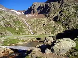 The back and forward lakes Stubensee (lit. Lake Stuben in German; Italian: Lago della Stua[1]) are located 2,423 m above sea level in the back part of the Pflersch valley, which is a left side valley of the Eisacktal. Similar to the Grünsee, one has to go by car until Ochsenalm (an alpine pasture) and then travel northwards high up route 6 until the lakes are reached after about four kilometers. At the forward lake, there is a snack station called Magdeburger Hütte (German for Magdeburg alpine refuge), which is named after the city in Germany.