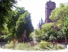 ![]() The central fountain in the western portion of the park; the park is bisected by Second Avenue. In the background is St. George's Episcopal Church | |