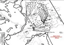 Each mine casemate controlled about 150 to 300 mines (depending on the harbor defended), arranged in groups of 19.[9] The mines in a group were generally laid about 100 ft (30 m) apart, in lines running across the channel being protected, with 50 ft (15 m) or less on either end of the line. This meant that one group of mines could protect a total distance of about 1,900 ft (580 m). About 3 miles (4.8 km) of cable were required to connect one group of 19 mines to its distribution box, with the connecting cables radiating out from the box in a hub-and-spoke fashion. Actually, the distribution box was usually located well behind the line of mines, so the pattern looked more like a 19-armed candelabrum with the box at its base.[1] If more groups of mines were needed, multiple mine casemates were generally built and equipped. For example, Boston had three mine casemates, with two originally at Fort Dawes on Deer Island (northern channels) and Fort Strong on Long Island (southern channels). Later in World War II, Fort Strong's mine casemate was deactivated and control of the southern mines passed to Fort Warren on Georges Island.