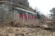 Another branch of the tramway track lead to the cable tanks, large concrete tanks filled with seawater pumped from the harbor and used for insulation and conductivity testing of the many miles of electrical cable that were used for mine operations. The torpedo storehouse had its own smaller tanks that were used for submergence testing of the mine casings and their fuzes, which were inserted into the casings through watertight plugs.