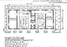 The shore cable from the underwater distribution box of each mine group ran back to a cable hut on the shore near the mine casemate, and from there to the casemate itself, where it was connected to a mine control panel (see photo at left). These panels were located in the casemate's operating room, pictured at left-center in the plan shown at right. (This is the plan of the Ft. Strong mine casemate, the one shown in the photo directly above it.)
