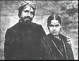 During his stay in Varanasi, Bharati was exposed to Hindu spirituality and nationalism. This broadened his outlook and he learned Sanskrit, Hindi and English. In addition, he changed his outward appearance. He also grew a beard and wore a turban due to his admiration of Sikhs, influenced by his Sikh friend. Though he passed an entrance exam for a job, he returned to Ettayapuram during 1901 and started as the court poet of Raja of Ettayapuram for a couple of years. He was a Tamil teacher from August to November 1904 in Sethupathy High School in Madurai.[7] During this period, Bharati understood the need to be well-informed of the world outside and took interest in the world of journalism and the print media of the West. Bharati joined as Assistant Editor of the Swadesamitran, a Tamil daily in 1904. In December 1905, he attended the All India Congress session held in Benaras. On his journey back home, he met Sister Nivedita, Swami Vivekananda's spiritual heir. She inspired Bharati to recognise the privileges of women and the emancipation of women exercised Bharati's mind. He visualised the new woman as an emanation of Shakti, a willing helpmate of man to build a new earth through co-operative endeavour. Among other greats such as Bal Gangadhar Tilak, he considered Nivedita as his Guru, and penned verses in her praise. He attended the Indian National Congress session in Calcutta under Dadabhai Naoiroji, which demanded Swaraj and boycott of British goods.[7]