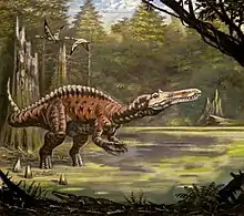 This environment was home to a variety of fauna including dinosaurs, pterosaurs, turtles, fish, hybodont sharks, and freshwater bivalves.[28][25] Suchomimus coexisted with other theropods like the abelisaurid Kryptops palaios, the carcharodontosaurid Eocarcharia dinops, and an unknown noasaurid. Herbivorous dinosaurs of the region included iguanodontians like Ouranosaurus nigeriensis, Elrhazosaurus nigeriensis, Lurdusaurus arenatus, and two sauropods: Nigersaurus taqueti, and an unnamed titanosaur. Crocodylomorphs were abundant; represented by the giant pholidosaur species Sarcosuchus imperator, as well as small notosuchians like Anatosuchus minor, Araripesuchus wegeneri, and Stolokrosuchus lapparenti.[25] The local flora probably consisted mainly of ferns, horsetails, and angiosperms, based on the dietary adaptations of the large diplodocoids that lived there.[27]