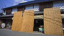 Sudare of various ages on a street in Kyoto. These are not cloth-bound at the edges.