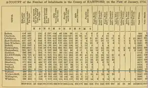 Slavery was common throughout the Connecticut River Valley during the 18th century, and the 1774 Census for the Colony of Connecticut listed 37 slaves in Suffield. Throughout the Connecticut valley, wealthy merchants, tavern owners and town ministers owned slaves. When Major John Pynchon originally purchased from the Pequonnocks and Agawam tribes a six-mile tract of land, which he called Stoney Brooke Plantation, he first ordered the construction of a sawmill, and used two of his slaves, Harry and Roco, for the construction.[10] Suffield's third minister, Reverend Ebenezer Devotion, became minister in 1710, and "sixteen years later the town voted to give him £20 to purchase a slave.[11] Reverend Ebenezer Gay, Devotion's successor, owned six slaves throughout his long term, 1742-1796. Reverend Ebenezer Gay Jr. manumitted his family's three remaining slaves in 1812. They were Titus, Ginny and Dinah.[12] "Princess," a slave belonging to early Suffield settler, Lieut. Joshua Leavitt, died November 5, 1732.[13] Some of Leavitt's descendants became ardent abolitionists, including Joshua Leavitt and his cousin Roger Hooker Leavitt, who operated an Underground Railroad station in Charlemont, Massachusetts.