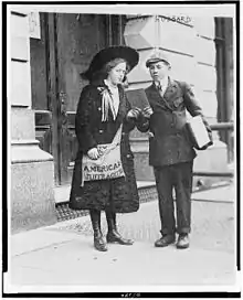 In the autumn of 1913 Emmeline Pankhurst had sailed to the US to embark on a lecture tour to publicise the message of the WSPU and to raise money for the treatment of her son, Harry, who was gravely ill. By this time the suffragettes' tactics of civil disorder were being used by American militants Alice Paul and Lucy Burns, both of whom had campaigned with the WSPU in London. As in the UK, the suffrage movement in America was divided into two disparate groups, with the National American Woman Suffrage Association representing the more militant campaign and the International Women's Suffrage Alliance taking a more cautious and pragmatic approach[67] Although the publicity surrounding Pankhurst's visit and the militant tactics used by her followers gave a welcome boost to the campaign,[68] the majority of women in the US preferred the more respected label of "suffragist" to the title "suffragette" adopted by the militants.[69]