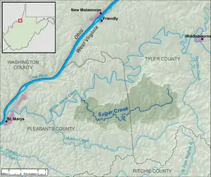Sugar Creek is a tributary of Middle Island Creek, 15 miles (24 km) long,[3] in northwestern West Virginia in the United States. Via Middle Island Creek and the Ohio River, it is part of the watershed of the Mississippi River, draining an area of 22.1 square miles (57 km2)[4] in a rural region on the unglaciated portion of the Allegheny Plateau.