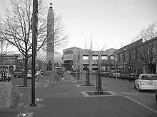 As a replacement, Mecham constructed a six-story building with apartments and ground-level retail/restaurants. Many residents and business owners in the area disapproved of the plans for fear that redevelopment would prevent local businesses from thriving and that big business and chain stores would dominate on and off the court.[4] For several years a fenced-off demolition site resulted in a scar-like crater and source of controversy in the neighborhood.[16] The Great Recession stalled the project.[17]