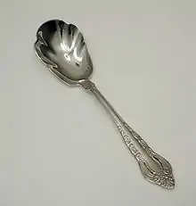 A sugar spoon is a piece of cutlery used for serving granulated sugar. This type of spoon resembles a teaspoon, except that the bowl is deeper and often molded in the shape of a sea shell, giving it the name sugar shell. Sugar spoons are sometimes called "sugar shovels" because of their rectangular shape and deep bowl. Sterling silver sugar spoons are used with formal silver coffee or tea sets.[1]