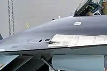 The Su-35 employs the powerful N035 Irbis-E ("Snow Leopard") passive electronically scanned array (PESA) radar, which is a further development of the N011M radar that had been evaluated on Su-27M test-beds and constitutes the core of the Su-35's weapons-control system. It is capable of detecting an aerial target up to 400 km (250 mi; 220 nmi) away, and can track thirty airborne targets and engage eight of them simultaneously; in addition, the multi-function radar is capable of providing high-resolution images of the ground using synthetic aperture mode.[41] The aircraft is equipped with an OLS-35 optoelectronic targeting system ahead of the cockpit to provide other forms of tracking including infra-red search and track.[41] For defences against enemy tracking, the Su-35 is equipped with the L175M Khibiny-M electronic countermeasure system,[42] while engineers have applied radar-absorbent materials to the engine inlets and front stages of the engine compressor to halve the Su-35's frontal radar cross-section and minimise the detection range of enemy radars.[43] The multi-role Su-35 can deploy air-to-air missiles of up to 300-kilometre (190 mi) range, and can carry the heavy Oniks anti-ship cruise missile, as well as the multitude of air-to-ground weaponry.[44][45]