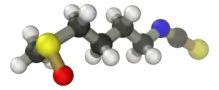 Sulforaphane (sometimes sulphoraphane in British English) is a compound within the isothiocyanate group of organosulfur compounds.[1] It is obtained from cruciferous vegetables such as broccoli, Brussels sprouts, and cabbages. It is produced when the enzyme myrosinase transforms glucoraphanin, a glucosinolate, into sulforaphane upon damage to the plant (such as from chewing or boiling during food preparation), which allows the two compounds to mix and react. Young sprouts of broccoli and cauliflower are particularly rich in glucoraphanin.[1]