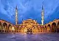 Sultan Ahmed Mosque (Turkish: Sultan Ahmet Camii), also known as the Blue Mosque, is an Ottoman-era friday mosque located in Istanbul, Turkey. A functioning mosque, it also attracts large numbers of tourist visitors. It was constructed between 1609 and 1616 during the rule of Ahmed I. Its Külliye contains Ahmed's tomb, a madrasah and a hospice. Hand-painted blue tiles adorn the mosque’s interior walls, and at night the mosque is bathed in blue as lights frame the mosque’s five main domes, six minarets and eight secondary domes.[2] It sits next to the Hagia Sophia, the principal mosque of Istanbul until the Blue Mosque's construction and another popular tourist site.