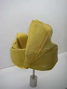 The Terengganu Sultan's Headgear (Solek Belalai Gajah). This woven songket headgear is worn by the Sultan of Terengganu. The songket is folded like a leaf bud pointing upwards, resembling an elephant tusk from which it takes its name. This headdress is folded in three layers with its point wounded to the right. This signifies the wearer is royal.