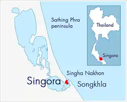 The Sultanate of Singora, sometimes known as Songkhla at Khao Daeng, was a port city in the deep south of Thailand and precursor of the present-day town of Songkhla. It was located near the southern tip of the Sathing Phra peninsula, on and around the foothills of Khao Daeng Mountain in Singha Nakhon.[1] British and Dutch East India Company traders called the city Sangora; Japanese officials knew it as Shinichu; contemporary French writers used the names Singor, Cingor and Soncourat.[2]