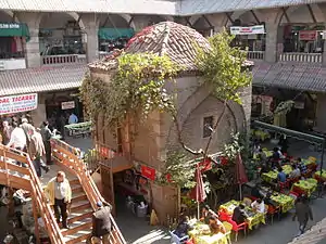Ottoman buildings usually have a vakfiye (inscription) of endowment. According to the vakfiye of Suluhan, the building was commissioned by Hasan Pasha, a regional beylerbey, and was constructed between 1508 and 1511.[2] According to other sources, it was commissioned by Mehmet Emin Bey, a Şeyhülislam, in 1685. The later date may be the reconstruction date. In 1929, the han was largely damaged as a result of fire. The remaining sections were used as a greengrocery marketplace.[3] However, in 1984, a reconstruction was carried out by the General Directorate of Foundations and the han now is mainly used for tourism and leisure, with cafés and souvenir shops.[4]