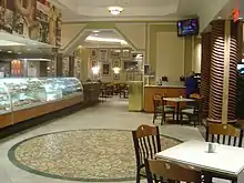 When the Suncoast opened in 2000, it planned to attract customers primarily through its various restaurants,[15] which included the St. Tropez buffet[47] and an oyster bar.[15] The resort's signature restaurant was Primo's, an upscale steakhouse located on the second floor.[15][48] Primo's included seating for 140 people, and provided views of the city through tall windows that were visible by all customers.[48] The resort also featured Via Veneto, an Italian restaurant designed around a large mural made of Tiffany-style stained glass. The mural, which included a character bearing an intentional resemblance to Gaughan, had initially been created for the Barbary Coast Hotel and Casino's opening in 1979. Señor Miguel's, a Mexican restaurant at the Suncoast that was named after Gaughan,[15] received a "B-" rating from the Las Vegas Review-Journal.[49]