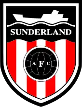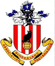 Sunderland played in an all blue strip from their formation until 1884,[5] when they adopted a red and white halved strip.[138] They assumed the current strip of red and white stripes in the 1887–88 season.[139] Their badge included a ship, the upper part of the Sunderland coat of arms, a black cat, and a football in front of Sunderland's red and white stripes.[140] In 1972 the badge was changed,[141] removing the black cat but still including a ship, a football and the background of red and white stripes.[142] This badge was first used on the match day shirt in 1977, replacing the simple black 'SAFC' initials which had been used since 1973.[143] The top section and border of the badge was coloured in blue until 1991, when it changed to black.[143]
