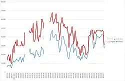 The club has had a historically large and passionate following, with the club seeing attendance figures larger than other more fashionable clubs. For instance a 2019 by the International Centre for Sports Studies (CIES) showed that over the prior 5 seasons (2013 to 2018) Sunderland recorded the 38th highest average attendance in world football with an average of 39,249 fans at the Stadium of Light. Sunderland's average attendance were higher over that period than perennial title challengers such as Juventus F.C. in Italy and FC Porto in Portugal.[156][157] Despite relegation from the Premier League in 2017 the club has continued to post large annual average attendance figures, recording over 30,000 for the 2019 and 2020 seasons, enough for 16th in the country.[158][159] Following relegation from the Championship at the end of the 2017/ 2018 season, Sunderland subsequently broke the League One division attendance record on 26 December 2018 in a match against Bradford City with a total of 46,039 fans.[160][161][162]