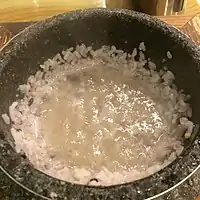 This drink is typically made from nurungji, the roasted (but not charred) crust of rice that forms on the bottom of a pot after cooking rice. Water is poured on this brown crust and the contents are put to a simmer until the water gains enough flavor of the scorched rice.[1]