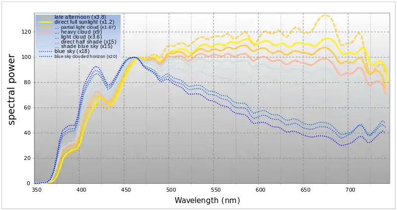 The Sun may be said to illuminate, which is a measure of the light within a specific sensitivity range. Many animals (including humans) have a sensitivity range of approximately 400–700 nm,[33] and given optimal conditions the absorption and scattering by Earth's atmosphere produces illumination that approximates an equal-energy illuminant for most of this range.[34] The useful range for color vision in humans, for example, is approximately 450–650 nm. Aside from effects that arise at sunset and sunrise, the spectral composition changes primarily in respect to how directly sunlight is able to illuminate. When illumination is indirect, Rayleigh scattering in the upper atmosphere will lead blue wavelengths to dominate. Water vapour in the lower atmosphere produces further scattering and ozone, dust and water particles will also absorb particular wavelengths.[35][36]