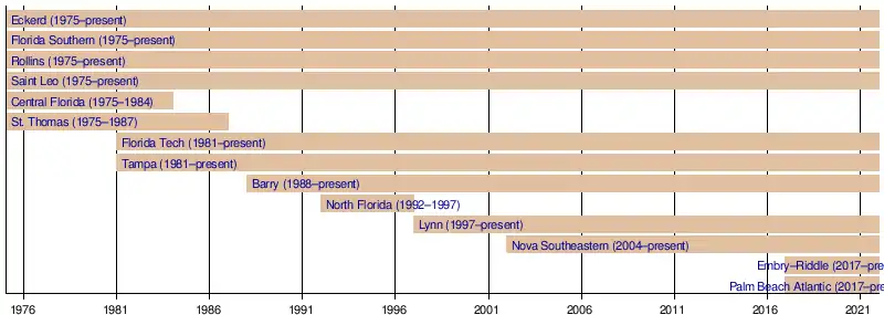 | Florida Southern College | Lakeland | 1883 | Private (United Methodist) | 2,185 | Moccasins | 1975 | |