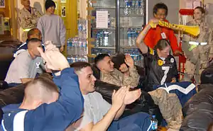 Because watching the Super Bowl is so popular, stores are often empty during the game, particularly in the regions represented by the two teams playing in the Super Bowl,[7] and water usage drops, with significant rises in use during halftime and after the game, as fans use the bathroom.[8] Additionally, churches sometimes cancel afternoon or evening services on Super Sunday, hold football-themed charity drives, or deliver sermons designed to appeal to male members of the congregation.[9][10][11]