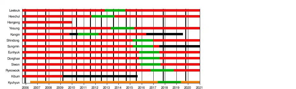 All members completed their mandatory military service during the time period from September 2011 through May 2019. Heechul enlisted on September 1, 2011, and completed his service on August 30, 2013. Leeteuk enlisted on October 30, 2012, and completed his service on July 29, 2014.[152][153] Yesung enlisted on May 6, 2013, and completed his service on May 4, 2015.[154] Shindong enlisted on March 24, 2015, and completed his service on December 23, 2016.[155] Sungmin enlisted on March 31, 2015, and completed his service on December 30, 2016.[156] Eunhyuk enlisted for active duty military service on October 13, 2015. He was discharged on July 12, 2017.[157][158] Donghae enlisted on October 15, 2015, and was discharged on July 14, 2017.[159] Siwon enlisted on November 19, 2015, and was discharged on August 18, 2017.[160] Ryeowook enlisted on October 11, 2016,[161] and was discharged on July 10, 2018. Kyuhyun was the last member in military service; he enlisted on May 25, 2017, and was discharged on May 7, 2019.[162]