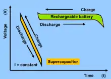 Both electrostatic and electrochemical energy storage in supercapacitors are linear with respect to the stored charge, just as in conventional capacitors. The voltage between the capacitor terminals is linear with respect to the amount of stored energy. Such linear voltage gradient differs from rechargeable electrochemical batteries, in which the voltage between the terminals remains independent of the amount of stored energy, providing a relatively constant voltage.