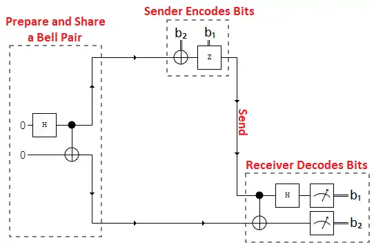 Suppose Alice wants to send two classical bits of information (00, 01, 10, or 11) to Bob using qubits (instead of classical bits). To do this, an entangled state (e.g. a Bell state) is prepared using a Bell circuit or gate by Charlie, a third person. Charlie then sends one of these qubits (in the Bell state) to Alice and the other to Bob. Once Alice obtains her qubit in the entangled state, she applies a certain quantum gate to her qubit depending on which two-bit message (00, 01, 10 or 11) she wants to send to Bob. Her entangled qubit is then sent to Bob who, after applying the appropriate quantum gate and making a measurement, can retrieve the classical two-bit message. Observe that Alice does not need to communicate to Bob which gate to apply in order to obtain the correct classical bits from his projective measurement.