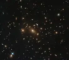 Early work on what was originally believed to be simply a new category of novae was performed during the 1920s. These were variously called "upper-class Novae", "Hauptnovae", or "giant novae".[24] The name "supernovae" is thought to have been coined by Walter Baade and Fritz Zwicky in lectures at Caltech during 1931. It was used, as "super-Novae", in a journal paper published by Knut Lundmark in 1933,[25] and in a 1934 paper by Baade and Zwicky.[26] By 1938, the hyphen had been lost and the modern name was in use.[27] Because supernovae are relatively rare events within a galaxy, occurring about three times a century in the Milky Way,[28] obtaining a good sample of supernovae to study requires regular monitoring of many galaxies.